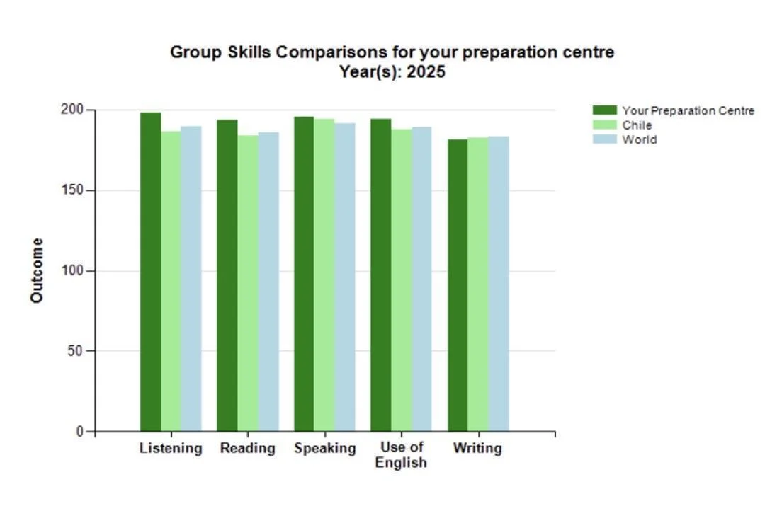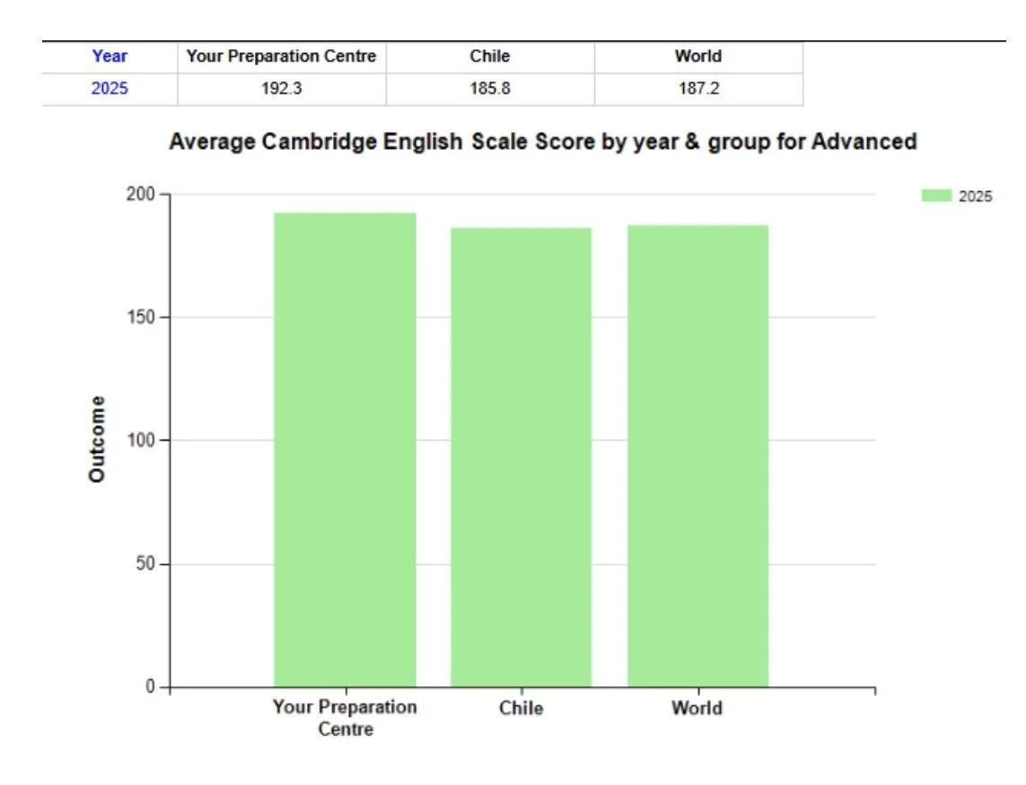 Queremos compartir con ustedes los resultados obtenidos por nuestros estudiantes en la certificación internacional C1 Advanced de Cambridge English, rendida durante el año 2025.En esta primera experiencia incorporando este nivel de certificación, logramos un desempeño que nos posiciona por sobre los promedios de referencia tanto a nivel nacional como global.Resultados generalesPromedio BRS: 192.3 puntosPromedio Chile: 185.8 puntosPromedio mundial: 187.2 puntosEstos resultados reflejan el nivel de desarrollo de las habilidades evaluadas: Listening, Reading, Speaking, Use of English y Writing.